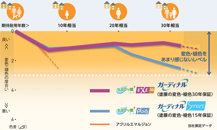 さらに低光沢で高級感のあるつやあり色も含めた全色に塗膜15年保証を付与しました。エスジーエルとの相乗効果による抜群の耐久性で長期にわたり安心してお使いいただけます。